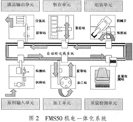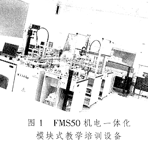 本课程的实训设备是以德国FESTO公司开发的综合技术在国际上领先的FMS50机电一体化模块式教学培训系统,如图1所示。它是FESTO公司结合现代工业特点开发研制的模拟自动化生产过程,集机械、电子、通讯于一体的高度集成的机电信息一体化实训教学装置。它涵盖了机械设计、传感器技术、自控技术、信息技术和计算机技术等多项学科的内容。该系统是一个模拟生产中、短行程气缸的柔性自动生产线,由10个独立的工作站、1个物流传输系统、2台CNC机床和特殊的软件及控制主机等组成。该系统使用与实际生产加工相同的工业元件,系统中的各工作站的功能单元能完成供料、工件检测、工件提取、工件加工、质量控制、机械手组装、工件暂存、工件提取及成品分捡等一系列过程。FMS50的每个单元均根据设定的任务,选择相应功能和技术参数的气动元件、传感器、电气元件及标准型材集成而成。它代表了当今现代化企业产品开发“采购和集成”的先进设计理念。工作单元之间具有柔性的结合方式,可以任意组合,系统的开放性很强,可以不断地将新技术融入系统中。