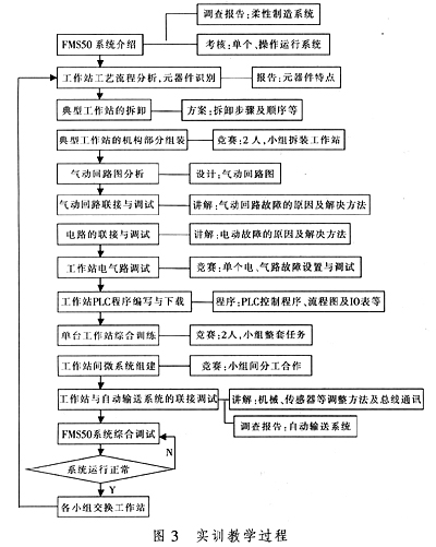 教学过程本实训课程的教学过程为:FMS50系统整体运行介绍——FMS50系统各工作站运行和功能分析——各工作站从系统上的拆解——单台工作站的解剖分析——单台工作站的装配——单台工作站气路联接——单台工作站电路联接——单台工作站电气路故障设置——单台工作站电气路故障排除和调试——工作站和输送系统联调——系统正常运行——整个过程结束。整个教学过程即为“化整为散,合散为整”的模式。对一套系统先进行功能分析,然后选取典型部件进行解剖,化整为散,化整为散后再根据相应的技术资料,对解剖后的零部件进行装配调试和故障分析。教学过程中首先讲解FMS50系统功能及工作流程,其次分组讲解各种典型工作站的功能及工作流程,接着教会学生看各种技术资料(机械装配图、气动回路图、电气接线图等),在拆工作站之前,要求学生完全明白各个工作站的功能、工作流程并作记录,注意拆卸前各个工作站的工艺及外观,并且各小组要先讨论拆卸方案与要点,保证设备能恢复原工作状态,实训过程中不得损坏元件,尤其是传感器、气缸活塞杆表面等。接着再让学生按照技术资料进行拆卸和安装,并严格要求学生正确使用工具和做好笔记,训练良好的工作作风,拆卸方案得到指导教师同意后方可进行,此项措施是保证设备完好的一项重要工作。各小组轮换工作站之前都要和控制系统相连,学习系统调试及系统使用的各项通讯技术,并保证轮换前每个工作站工作是完全正常的。防止轮换后损坏的元器件责任不清,并严格强调发生任何故障一定要立即报告指导教师,否则责任由小组学生自己承担。实训教学的具体过程如图3所示。