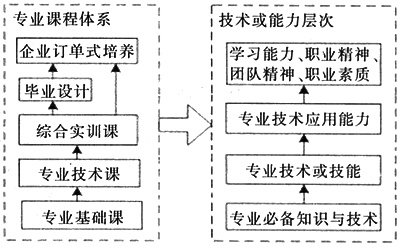 职业技能或技术有其自身的特点和培养规律。总体来说,可以将职业技能分为基础技能和专业技能。基础技能是某职业岗位群从业人员必须掌握的基本功,专业技能是某职业岗位群从业人员必须掌握的专门技术。这种技能的层次性和培养规律决定了在具体教学过程中,必须采取层次化的实践教学方式。这种层次化应该体现在课程设置、教学案例的选取、教学过程控制以及教学的考核目标与方式上。经过多年探索,大部分高职院校的相关专业均形成了能够突出能力层次的专业课程体系,如图所示。