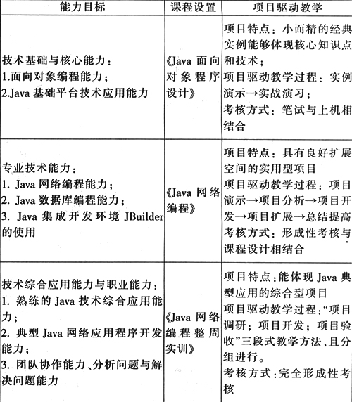 我系软件专业电子商务技术方向以目前两大主流软件技术之一的Java技术为教学主线,把熟练的Java编程能力作为学生的核心软件开发能力进行重点培养。在教学实践中,我们根据认知规律和多层次项目驱动教学模式基本思想,明确了Java编程能力的层次性,对现有课程进行调整,形成了针对该能力培养的新的课程设置,不同层次的课程采用不同的项目驱动教学形式。