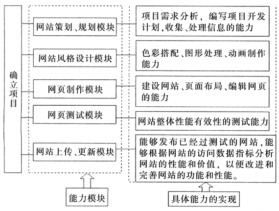 完成项目需求分析后,教师应根据学生所作的需求分析确定项目的能力模块,并将每个能力模块细分为一系列小项目,学生根据课程的时间安排,结合项目内容编写项目开发计划书。例如,根据我校《网页制作技术》课的实际情况,将首次接触这门课程的学生的能力模块划分如下(见下图)。