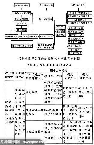 以作业流程为导向,构建以岗位技能为核心的模块化专业课程体系以岗位技能为核心的模块化课程体系如下页图所示。模块化课程体系应突出体现人才培养的层次性,尊重学生的个性化发展。学生在学好公共基础课和专业基础课的基础上,可选择模具设计(较高层次)、模具制造或模具钳工(一般层次)的发展方向,实现学院引导,学生自主选择职业方向,真正体现“以学习者为中心,以就业为导向”的人才培养宗旨。课程体系构建与专业教学计划制定应按以下思路进行:(1)以作业流程为导向,分析每个职业方向模块应具备的专业能力、知识和素质。(2)设计职业方向模块,确定每个职业方向模块所开课程;确定职业方向模块对应的职业资格证书;确定课程的开出顺序。(3)构建课程体系。将公共基础模块、专业基础模块和职业方向模块组合成新的课程体系,具体课程设计如下页表所示。