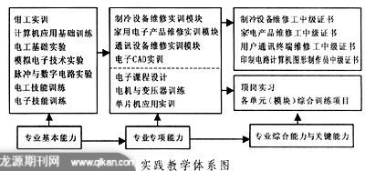 专业基本能力主要是指职业岗位群所需具备的最基本操作能力;专业专项能力是指适应岗位要求,所应具备的专业核心能力;专业综合能力是综合运用各专项能力解决实际问题的能力;关键能力由方法能力和社交能力两部分组成。根据宽基础加专门化培养方向(活模块)的专业课程体系模式和专业岗位群的特点,电子技术应用专业设置了家用电子产品生产和维修、制冷设备生产与维修、通讯产品制造与维修三个专业化培养方向,实践教学体系也设置了家用电子产品维修实训模块、制冷设备维修实训模块、通讯设备维修实训模块,使实践教学体系内容涵盖了相应的国家职业资格证的要求,使能力培养目标具有较为明显的职业定向性和针对性,使学生在取得学历证书的同时获得相应的资格证书,实行“双证”制度,提高学生的就业竞争力。