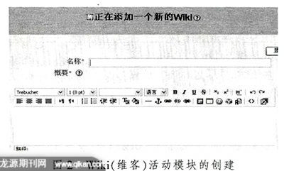 从图1我们看到通过添加各种活动可实现课程内容的创建。我们要进行无纸化集体备课,可以利用添加Wiki(维客)活动模块来实现。单击“Wiki”添加一个Wiki。我们只需在弹出的界面上输入一个标题和说明文字就可以了。具体见图2。