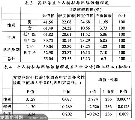 其次,高职学生的网络依赖程度具有个人特征上的明显差异。通过对高职学生在网络依赖四个维度上的测试可以看出,男生与女生、高年级学生与低年级学生在各个维度上的测试结果均存在一定差别,而文科生与理科生测试结果差别不大。为了验证这一结论的真实性,笔者运用SPSS对网络依赖进行了性别、年级、专业类别方面的独立样本t检验。由检验结果可知,不同性别高职学生的网络依赖程度存在统计学意义上的非常显著差异;不同年级高职学生的网络依赖程度存在统计学意义上的显著差异;不同专业类别高职学生的网络依赖程度不存在统计学意义上的差异。