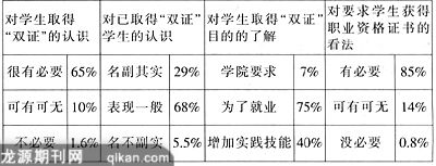 对取得“双证书”学生的评价,调查结果表明,大部分教师认为取得“双证”的学生其技能水平一般,证书与本人具备的真实水平间有差距。这种看法在一定程度上说明,一部分教师对职业资格证书的认识不够清晰,培训鉴定工作与实际水平仍有较大差距。证书只能说明学生具备某方面的资格,而不足以代表学生的真实水平。真正的水平还要通过实践检验,二者不是完全成正比的。这就告诉我们,今后还要加强学生的技能训练,使职业资格证书真正名副其实,经得起社会和用人单位的检验。