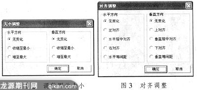学生添加完所有的控件后可以单击菜单栏中或工具栏中的“大小调整”和“对齐调整”按钮,系统弹出相应的窗口,学生可以对选中的图元控件进行布局调整,如图2和图3所示。