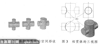 CAXA辅助相贯线教学相贯线是两个立体相交所形成的表面交线。而常见回转体相交所形成的相贯线是《工程制图》教学中“相贯线”的难点。在一般情况下,两曲面立体的相贯线是闭合的空间曲线;在特殊情况下,两曲面立体的相贯线可能不闭合,也可能是平面曲线或直线。对于求解常见的两回转体相交所形成的相贯线,常用的方法有积聚性法和辅助平面法。一般情况下,只要采用上述方法对相贯体进行分析,学生就可以完成相贯线的求解问题。但学生往往在想象相贯线的空间形状方面感到困难。在讲解“相贯线”这部分内容时,可以利用CAXA建立三维实体模型的功能,形象直观地演示相贯体的类型、相对位置、组合方式、空间形状以及相贯线的空间形状,帮助学生提高空间想象能力,熟练掌握该部分内容。具体做法如下:(1)建立两个直径相等正交相贯的圆柱体,利用三维球的功能复制成三个圆柱体,在智能图素状态下,改变各圆柱体的直径,D1变小,D2不变,D3变大。结果如图2。(2)选中它们的相贯线并把它转化为3D曲线并用三维球功能把3D曲线移出,这些空间3D曲线就是相贯线的空间形状。取图2中的第三个相贯体为研究对象,新建一个工程图,把相贯体和空间曲线作为一个整体生成标准视图,在视图中选择主视图、左视图、俯视图、轴测图。生成结果如图3。在图3中白色的线是和相贯线完全重合的空间曲线,通过轴测图可以看出空间曲线在两个圆柱体的表面上,通过三视图可以看出在三视图中的具体位置。
