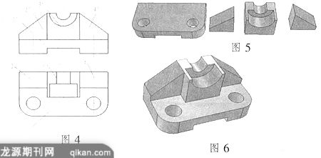 CAXA辅助组合体教学从形体的角度来分析,任何机器零件都可以看成是由一些简单的基本几何体组合而成的组合体。通常组合体的种类按构成方式可以分为叠加式、挖切式和综合式三种。组合体的分析方法主要有两种方法:形体分析法、线面分析法。其中,形体分析法多用于对叠加式组合体的分析;线面分析法多用于对挖切式组合体的分析;有时两者兼用分析综合式组合体。而CAXA实体设计有两种造型方法:第一种是搭积木的方式适合叠加式,第二种是拉伸、旋转、扫描等适合叠加式、挖切式和综合式。利用CAXA可以先将组合体模型直接生成标准视图,然后,在CAXA电子图板中,通过菜单“文件—实体设计数据接口—接收视图”打开标准视图,在电子图版的环境下进行标注。例如:如图4,已知主、俯视图,补全左视图。第一步,抓特征,分线框(如图4);第二步,对线框,想形状(如图5);第三步,综合起,想整体(如图6)。