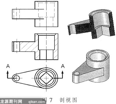 CAXA辅助剖视图教学剖视图是用来表达零件内部结构形状的投影图。在剖视图教学中,学生对形体内部结构的理解有一定的困难,同时对于剖切方式和剖切位置的选择也不好理解。在教学中应用CAXA进行演示,利用其提供的剖切功能,能使以上问题迎刃而解。CAXA可以在“工程图”模块下完成各种形式的剖视图。在零件模块下,完成剖切平面的选择并按规定位置剖开零件,以直观的三维旋转动态形式进行课堂演示,从而激发学生的学习兴趣,取得较好的教学效果。为了直观地讲解剖视图的概念,可以利用CAXA在直接绘制出机件的模型,利用CAXA的截面工具(如图7所示),直接向学生演示剖视的概念。学生在真正理解了剖视的概念后,对剖视图的画法就能轻松掌握。