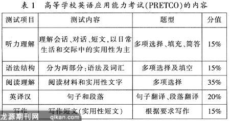 该测试内容包括五个部分:听力理解、语法结构与词汇、阅读理解、翻译(英译汉)和写作。具体内容如表1所示。
