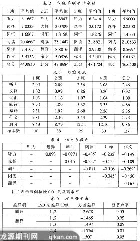 从各项考试内容的相关性看,按照理论分析,各个部分应该是相辅相成,呈正相关关系,但结果分析却大大出乎意料,基本上各项考试内容均呈负相关关系,听力与阅读、翻译呈负相关关系,且通过了0.01双侧检验的显著水平。这个结果反映出学生在学习过程中各项学习的隔离性,读、写、听、译本是一种综合能力,但是,学生为了应付考试,过多地进行专项练习,结果导致英语学习的“板块分割”。阅读与翻译本应该呈正相关,结果分析呈负相关,阅读部分的试卷得分普遍偏低,说明学生在学习过程中除了存在上面的问题外,阅读不求甚解;词汇量的增加本应有助于写作水平的提高,但是,这两项仍然呈负相关,说明学生在学习过程中为了背单词而背单词,为了写作而写作,不能有机地将二者结合起来。从班级差异上看,采用方差分析的结果也值得思考,本次调查的四个班级中,1、2班是文科班,3、4班是理科班,虽然从总分来看,四个班级的差异性不显著,但是在各个项目上却出现了明显差异,这就要求教师在实际教学中针对不同的学生因材施教。翻译与写作属于主观性考核,反映了学生的思维方式,因此,这两项在文科和理科班具有明显的差异。即使同是文科班或理科班,在阅读、翻译、作文这三项,班级之间也存在差异,究其原因,授课方法是主要因素,但是也可能与班级的学风与学生整体的学习态度有关。通过对任课教师的调查发现,即使教师任教的都是文科班或理科班,课堂气氛与学生整体的学习态度也会导致任课教师实施不同的授课方法。