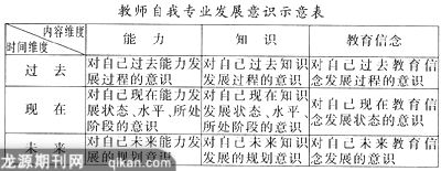学者白益民认为:“教师的自我专业发展意识,按照时间维度,其内容构成至少包括三方面:即对自己过去专业发展过程的意识,对自己现在专业发展状态、水平所处阶段的意识以及对自己未来专业发展的规划意识。笔者以为,教师自我专业发展意识不仅可以从纵向时间的维度加以考察,还可以从横向内容的维度进行分析。教师自我专业发展意识在内容上包括对高职教师能力、知识、教育信念发展的意识。综合时间与内容这两个维度的分析,可以将教师自我专业发展意识具体化,如下表所示。