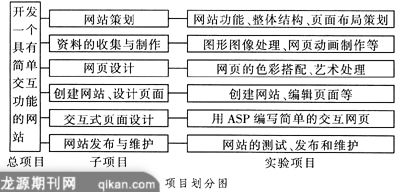 确定项目在制定项目时,要进行科学规划,力求所制定的项目不仅有利于教学的开展,而且有利于调动学生的学习积极性。要对具体的项目提出明确的知识目标和能力目标。我们将《网页设计》课程的总项目确定为开发一个具有简单交互功能的网站,并根据其涉及的知识点,将课程总项目划分为若干个子项目,每个子项目再根据知识点划分为若干个由基本知识、基本操作构成的实验项目。项目划分如下图所示。项目以任务书的形式下发给学生,按制定计划、开发、调试、发布和实际运行、设计报告及项目展示等阶段写出时间和目标要求。
