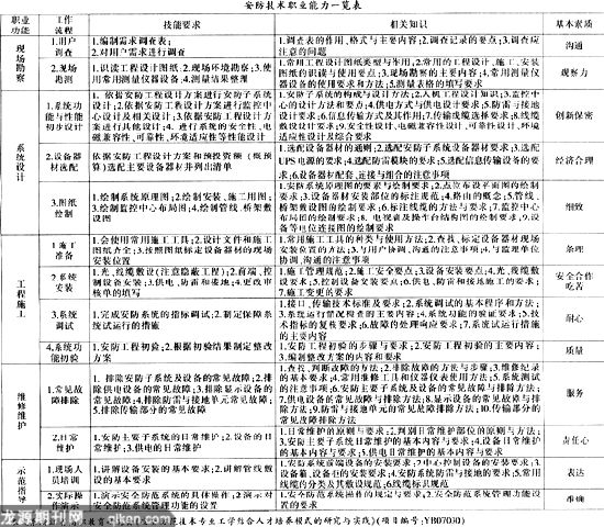 遵循以上思路,应继续研究《标准》中各级的基本要求和工作要求,在三级标准的基础上,结合二级标准的相关内容,突出技术实用性与知识重点,制定出包含职业功能、工作流程、技能要求、相关知识、基本素质等内容的职业能力一览表(见上表),并据此统一教学思路,构建高职安防专业的技能体系。
