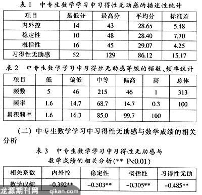 许多研究者都指出学困生是习得性无助感的高发群体。大多数中专生数学基础薄弱,数学学习成绩差,对知识的感悟力不强,他们在数学学习过程中会遇到更多的学习困难,也更容易产生习得性无助感。因此,研究数学学习中的习得性无助感问题,对减轻学生的心理困扰和心理负担,减少学习阻碍,提高学生学习数学的积极性很有意义。