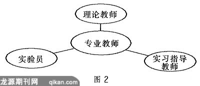 2.理论教师与实验教师一体化。即专业理论课教师与实验、实习指导教师一体化。如图2所示,他们应具有扎实的专业理论基础,较高的操作技能水平和丰富的实际教学经验。在课堂上是教师,在实验、实训中是技师,既能讲授理论课,又能操作演示传授技艺,还能解决现场技术问题。