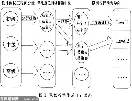 通过研究软件企业软件测试人员的主要工作后我们发现:一个软件测试团队一般是由具有不同技能和经验的人员搭配而成的。对三个级别测试工程师所需要具备的能力和需要承担的工作进行分析,将教学目标定位在初级和准中级上。进一步分析初级、中级测试工程师的工作内容和所需要的技能,将这些技能按照渐进的顺序分为不同的组,当掌握了该组所需要的技能之后,就可以认为达到了一个新的测试工程师等级。这样,在教学过程中可以循序渐进地让学生掌握不同的技能组,每完成一个技能组,都可以完成对应的实际工作。考虑到教学目标,可以设置4个技能组,当完成这些技能组的学习之后,学生能够达到初级和准中级测试工程师的要求。由于不同技能等级的定义,完全取材于实际的岗位需求,因此学生能够通过课程学习,满足实际工作的初始要求并在后续的工作中不断提高。课程教学体系设计思路如图1所示。