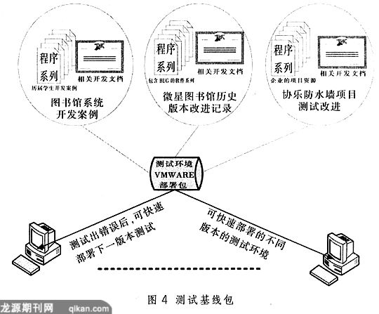 软件测试教学面临的重要问题是项目案例的组织和规划,为此可以组织开发不同层次的软件测试基线包用于教学,其中包含几个主要内容(见图4):一是历年典型的学生开发项目案例;二是包含着人为设置的软件缺陷的软件系列,所设置的缺陷代表着在实际软件开发过程中的典型问题;三是企业的项目资源,包括项目需求文档、项目设计文档以及项目软件的不同版本,这些资源能够让学生接触到完整的案例,并且由于基线包中包含了软件的不同版本,从这些版本中,可以清晰地发现软件缺陷是怎样被不断地发现和修复。