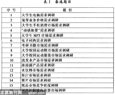 市场调研准备阶段首先,指导教师做市场调研实训动员,强调市场调研实训注意事项,并对学生进行分组和抽签选题。我们将70名学生分为7组,每组10人,准备了16个备选题目(见表1)。其次,在指导教师指导下,学生以小组为单位依据选题查阅相关市场调研资料,依据选题设计调查问卷。最后,指导教师指导修改调查问卷。经审阅合格后,打印问卷,完成调研准备工作。
