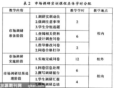 市场调研实训教学学时为32学时,采用校内与校外相结合的方式。具体学时分配见表2。