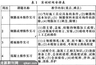 水利工程施工的工种主要包括土工、灌浆工、砌筑工、模板工、钢筋工、混凝土工、吊装工、电焊工、爆破工、抹灰工等。我们从中选取出技术性要求高,在水利工程中最常用、最基本且适合校内实训工场操作的工种:模板工、钢筋工、混凝土工,同时精心安排了为期4周的工种实训。实训时间安排如表1所示。