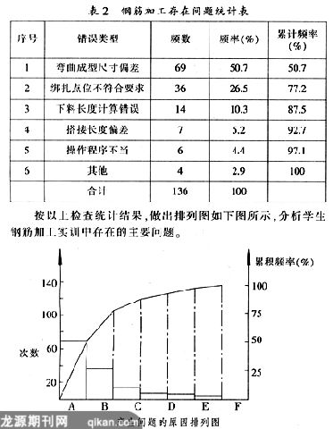 为了解决实践教学全过程管理的问题,提高效果,我院在加强教学信息反馈上,尝试把全面质量管理(TQM)的常用方法引入到实践教学管理中来,由指导教师加强学生实习过程的记录,然后将存在的问题统计填入表2(以钢筋加工为例)。