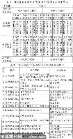 “四层能力”:实现素质教育与“零距离”就业能力的统一“234模式”以培养高级应用型外贸人才为目标,根据教育的规律,从高职教育自身特点出发,整合专业基础课和专业课,以综合职业素质模块(以素质教育为主)——基础职业能力模块(以基础职业能力培养为主,兼顾岗位专业能力的培养)——职业技能模块(以岗位专业能力的培养为主)——“零距离”就业模块(以培养“零距离”就业能力为主)为主线构建课程体系。这一课程体系以“零距离”就业能力培养为统领,首先,通过确保综合职业素质模块的教学,强调学生思想道德素质、学习态度、职业态度、身心健康的培养,养成学生良好的职业素质;其次,通过基础职业能力的培养,夯实学生的能力基础;再次,通过加强职业技能培养力度强化学生就业能力;最后,通过模拟综合实训和毕业实习,为完成从基础理论知识掌握与基本素质形成到“零距离”上岗的平稳过渡打下坚实基础。