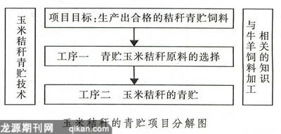 以玉米秸秆的青贮为例,将整个生产过程确定为一个项目单元。为了更好地实现项目教学目标,使学生能在规定时间内掌握本项目知识,以介绍目前国内外的饲料行情引出项目的主题:生产出合格的青贮玉米秸秆。之后,引导学生将工作项目分为两个工序。工序一是青贮玉米秸秆原料的选择,工序二是玉米秸秆的青贮。这样可以使学生的思路更加清晰,目标更加明确。具体项目分解见下图。工作项目提出后,以学生动手实践为主线,其中穿插必要的理论知识讲解。