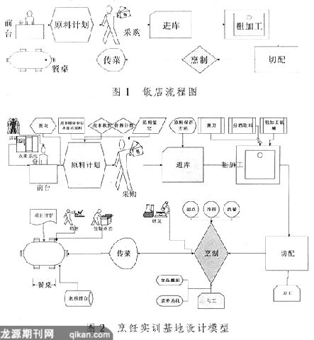 烹饪实训基地的设计模型(图2)则是在饭店一般生产流程的基础上,结合实训教学的需要,既让学生感受到饭店企业真实的生产环境,又要在真实的生产环境中,学会岗位需要的知识,训练学生的能力,同时,还要为产品开发提供载体,整个设计围绕企业真实的生产流程进行,具有系统性、综合性。
