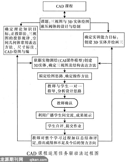 “教学的艺术不止在于传授本领,更在于激励、唤醒、鼓舞学生”,这是德国著名教育家第斯多惠提出的教育思想。教学的目的不仅是让学生掌握基础知识和技能,更重要的是进一步激发他们的学习兴趣,增强信息意识和创新意识,培养他们的自学能力和创新能力。课程教学方法应依据“教、学、做合一”的原则,根据课程特点,充分利用新技术在教学中的应用和教学方法的改革。任务驱动法就是在学习的过程中,学生在教师的帮助下,紧紧围绕一个共同的任务活动中心,在强烈问题动机的驱动下,通过对学习资源的积极主动应用,进行自主探索和互动协作的学习,并在完成既定任务的同时,引导学生进行实践活动。在CAD课程教学中采用任务驱动法,可以结合学科的特点,充分的体现教师的主导作用,发挥学生的主体作用,更好地培养学生的创新意识和创新能力,培养出时代所需的创新型人才。