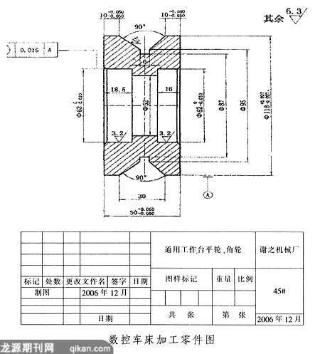 加强校企合作,推进理论与实践、教育与生产劳动相结合我校积极发挥本地资源优势,与本地一家有规模的机械厂进行形式多样的合作,教师在实习车间讲课的过程中,采用教学课题与生产实践相结合、教学过程与生产管理相结合、教学课堂与生产环境相结合、课程设计与生产实际相结合的形式。如图所示的工件,工人一般都用普通车床加工,由于该零件精度较高,特别是用普通车床加工90°的凹槽很难控制,加工效率低,工人都不愿做。该厂老板了解到我校有数控车床,要求我校帮助加工这批零件。我校教师针对学生对数控车床G71指令编程难理解、用切断刀加工工件很难理解对刀点坐标及走刀路线等问题,就结合这类实际零件对学生进行讲解,与学生共同分析加工该零件的正确工序与编程参数,最后反复研究确定按下列工序加工该零件:(1)装夹左边→找正→车端面→打中心孔→钻孔→粗、精车内孔至尺寸→倒角→换外圆刀粗车外圆。(2)调头反爪装夹内孔→找正→粗、精车端面→粗、精车内孔至尺寸→倒角→换外圆车刀加工外圆至尺寸→换机夹切断刀加工90°凹槽。我校加工的这批零件经厂家质检,100%符合要求,特别是90°凹槽,误差小于2′,效率亦提高40%。通过校企合作,学生实习就像在工厂上班一样,教学环境更贴近实际,贴近工厂生产过程,营造了一个良好的职业教育氛围,使学生很快掌握了熟练的操作技能,为以后走上工作岗位增强了适应能力。