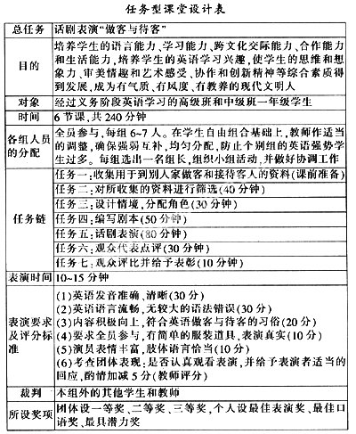 将该任务分成四个小任务,分别为收集相关词语和句子(如表示问候、寒暄、介绍、交谈、劝餐、送别等交际用语)、收集礼仪文化方面的相关信息(言语、肢体语言、着装要求等)、收集饮食文化方面的有关信息(饮食习惯、就餐要求等)、了解英语话剧及其剧本的主要组成部分。各组员根据自己的兴趣和特长,选择某一子任务,并通过查找图书馆书籍、上网、观看电视和电影等各种途径完成任务。