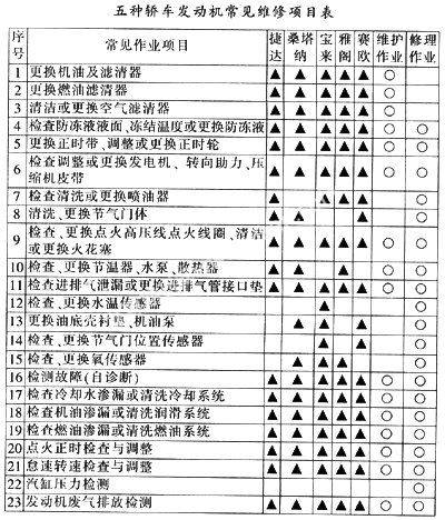 五种轿车发动机常见维修项目见下表。