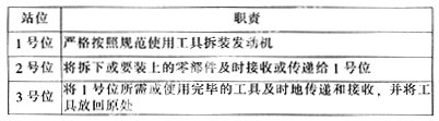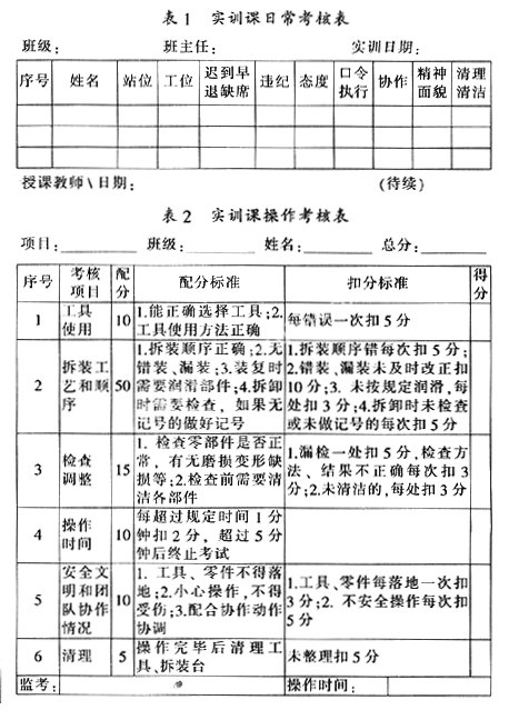 3.教学过程把握。我们通过多次实践,将整个教学过程分为三个阶段是最为切实有效的。第一阶段,利用课件投影示范,教师按站位分别下达操作口令,学生先看后听再练。第二阶段,教师将每一作业项目的操作步骤一次讲完,包括工具使用、操作要领和部件位置摆放等,下达“操作开始”口令后,学生按照分工职责自行操作,完成后跨立于站位上,这样就加快了实习进程。第三阶段,站位更替,即发动机每拆装一遍就进行一次站位更替。目的主要是使每位学生完整掌握拆装工艺,另外也是为了平衡学生的心态。需要注意的是,在学生操作过程中,教师应在工位间巡视,指导学生并纠正学生的错误动作,同时,根据考核要求进行日常考核。