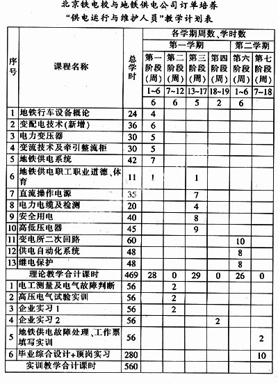 教学计划制定由就业办和相关专业科负责与企业联系,了解企业对人才知识结构和技能结构的要求,由专业科制定“订单班”教学计划的初稿。专业科与企业专家一起对教学计划中的课程设置、教学进度及教学方式进行探讨与修订,根据企业和学校的实际情况确定工学交替的教学计划。教学过程分阶段进行,阶段的划分不是根据学期,而是根据企业的用人需求和教学内容的需要,以由浅入深、由易到难的模块组成,每个模块均由在校理论学习阶段和到企业顶岗实习阶段组成。每一门课程的教学大纲需请企业专家与学校一起制定并审核。教师编写的专业或职业课程的授课计划需经企业专家审批后才能实施。在课程开发上,依据企业产业结构与产品结构的调整,不断补充、更新、修正和完善教学内容,使教学内容能灵活地适应新设备、新技术、新工艺的发展。下表为地铁供电“订单班”的教学计划。