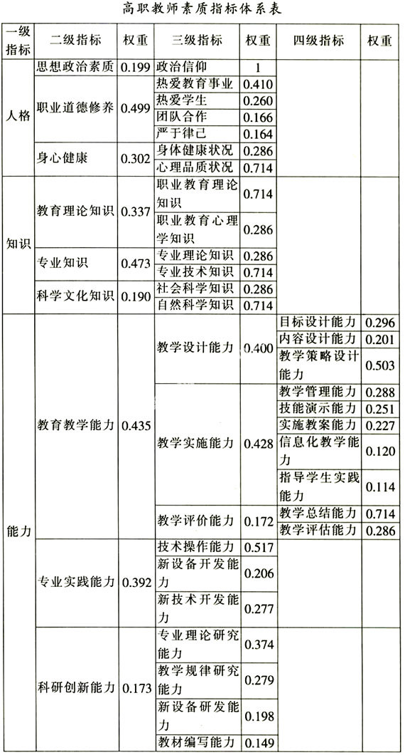 层次分析法的基本步骤如下:建立层次结构模型,构造判断矩阵,进行层次单排序及一致性检验,进行层次总排序及一致性检验。为了使权重更加合理、准确,笔者设计了一份问卷调查表,分别对高职院校管理者与高职教师进行了调查。共发问卷500份,回收458份,有效问卷438份。在此基础上,构建了高职教师素质结构模型。笔者认为,这种高职教师素质结构模型所体现的教师素质观有助于构建高职教师继续教育的理论体系,为教师继续教育提供理论依据。高职教师素质模型指标体系表如下所示: