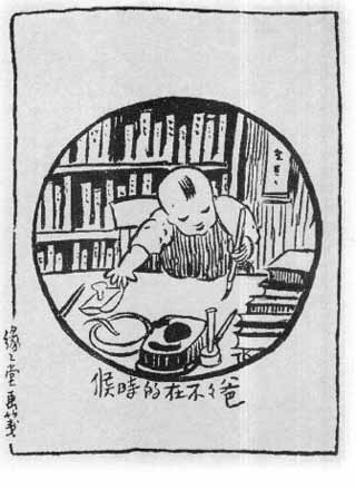画中的男孩是我的大弟瞻瞻(丰华瞻)。他趁爸爸不在的时候,爬上椅子,拿起毛笔(用左手),在书桌上乱涂一番。