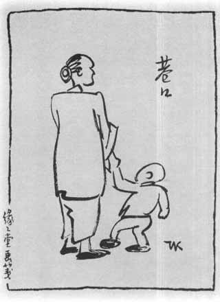 但父亲用古诗句作画,画的往往是另一回事,与古诗内容不一定有关。在《巷口》这幅画中,我们看到一位老太,手里牵的想必是她的孙儿。他两人在巷口观望。大约在巷内、在家里太闷热,孙儿吵着要奶奶带他到巷口走走,那里可以看路边的来往行人,又可看街上的车水马龙。这男孩很顽皮,走路像在跳舞,幸亏奶奶个儿高大,站得稳稳的,才不致被他牵倒。