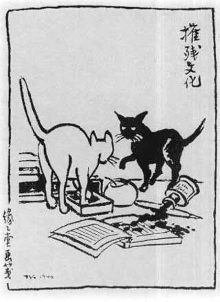 可是一到了“文革”中的“造反派”手里,他们又要从豆腐里寻骨头了。他们说,父亲在1940年抛出这幅黑画,是为了麻痹人民,说什么白猫黑猫是影射日本侵略者和中国共产党,意思是“不论白猫、黑猫,反正都是坏猫”。