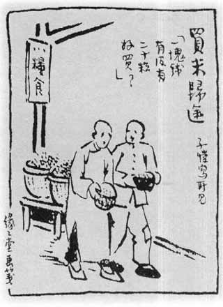 抗战胜利后,满以为不再会有这种情况。岂料物价飞涨。1947年6月3日登载在上海《申报》上的这幅画,描写“买米归途”,两个贫穷的公务员自语说:“一块钱有没有二十粒好买?”