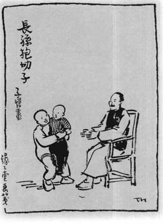 画中的老人,想必是个多子女者。他的长子已经有了个十来岁的儿子,他早已当上爷爷,而自己却又生了个幼子,幼子反比孙儿小!他的长孙已经大到抱得起他的幼子,不过抱得有点吃力,爷爷连忙伸出双手,要把宝贝幼子接过来。