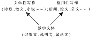 “记叙文”“说明文”“议论文”的出现显然是西学东渐的结果,然而在西方的文体论中并没有这样的划分。他们只有“记叙(narration)”“描写(descrip-tion)”“说明(exposition)”等等概念,这些概念,我们称之为“表现形式”。“表现形式”进入我国,变成了“文体”,而且双轨并行,这固然有文化传统因素(我国传统的“语文”不是“语言+文学”而是“文章”,所以从陈望道先生《作文法讲义》开始就以表现方式命“文”),更直接的原因是考虑到中学教学的需要。这三种文体的使用范围,通常只限于学校语文教学这个特定阶段。刘国正先生曾经有过解释:“记叙、说明、议论,是三种主要表达方式,只是为了教学之便才称之为‘文体’。”(《关于“实用文体”的通信》《语文学习》1991年12期)这种处理实质上是把“记叙”“说明”“议论”理解为各种文体的胚胎状态。按照这样的理解,“三大教学文体”与按功能分类的各种文体之间的关系可以图示如下: