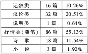 毋庸置疑,新课程标准的许多理念是先进的,它解除了学生身上的某些桎梏(特别是有才华的学生)。随着我国政治、经济形势的发展,中学生习作中出现了一些可喜的成果。然而,有一些倾向值得注意。我曾利用某重点中学的一本《作文选》作了一些统计分析,情况如下(共156篇)