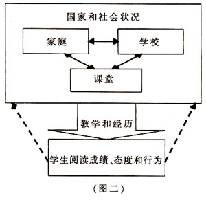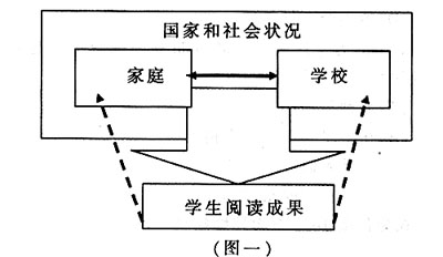 PIRLS2001确定了影响学生阅读成就的三个情境:家庭、学校、国家和社会。(见图一)
