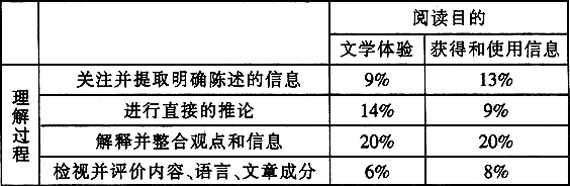 阅读能力中的理解过程和阅读目的是紧密结合在一起通过阅读测试进行考查的。PIRLS评价框架确定了与参加测试的年龄组学生相关的两个主要的阅读目的:为文学体验而阅读;为获取和使用信息而阅读。另外,框架还确定了读者在两种阅读目的中同样要使用的四个理解过程:关注并提取明确陈述的信息;进行直接推论;解释并整合观点和信息;检视并评价内容、语言和文本成分。以上的每一个理解过程在上述两种不同的阅读目的中都将受到评价,但是,不同阅读目的及理解过程在评价中所占的百分比存在着一定差异。