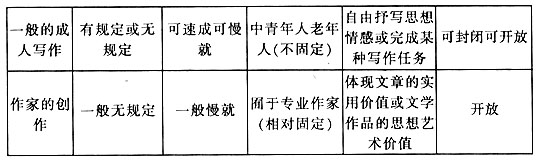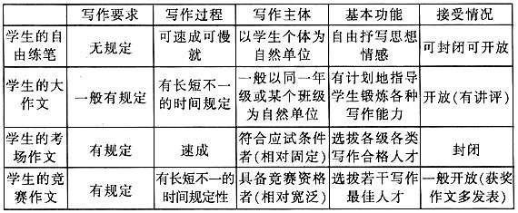 理论层面上的主要原因是:涉及作文教学全过程的一些最基本的理论问题我们尚不明确,作文教学没有科学实用的写作理念作引领。其一,高中作文教学的基本目标是什么?虽然新课标已明确规定,让学生“进一步提高记叙、说明、描写、议论、抒情等基本能力”,近几年也有人撰文作了专题探讨,但仍有一些“业内人士”认识不清,如认为它兼有指导文学创作,甚至有培养少年作家之重任等。(sup)⑤(/sup)其二,对“练笔(小作文)”“大作文”、“考场作文”“竞赛作文”与“一般成人写作”“作家创作”这六种常见的写作样式认识模糊,给作文教学带来了许多的混乱。从本质上看,它们虽然都是写作活动,但其特质