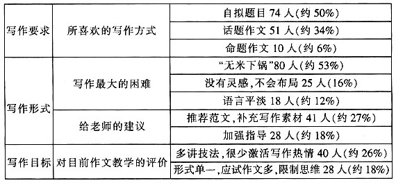 调查显示,平时的作文课上,多数学生被动写作,热情不高,困难重重。问题症结何在?程红兵先生一针见血地指出,一些作文课“搞的是八股文的那一套,而不考虑学生的真情实感,学生的文章毫无生气;能力训练机械化,题海泛滥,荒诞离奇”。(sup)⑥(/sup)