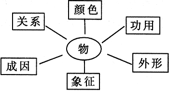 师:其实对于任何事物,我们大致都可以从物的外形、功用、成因、物与物的关系、象征意义等不同的角度由物及人展开联想。有些事物还可以从颜色这个角度来立意(老师完成板书)。