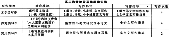 选修阶段写作的安排 目前苏教版选修教学基本上形成了这样的局面:各个学校大多把《史记选读》(或《唐宋八大家散文选读》)、《唐诗宋词选读》《语言规范与创新》《实用阅读》作为必选,形成相对集中统一的选修课程。这虽然比较迁就现实高考的需要,具有较强的功利色彩,但也基本上反映出现阶段人们对语文素养的一种认识。选修阶段的写作就依据选修模块的开设顺序逐次展开,不断丰富深化。我们可以在《现代散文选读》教学中,穿插安排散文、小诗、小小说、人物传记、杂文的写作;在《史记》《唐诗宋词选读》教学中,结合经典的诗文作品,指导学生写鉴赏性小论文和研究性小论文,探讨作品的思想内容、表现手法、表现风格和艺术流派;在开设《语言规范与创新》《实用阅读》的过程中,相机组织调查报告等实用文体的写作。虽然各地区、各学校选修模块的开设顺序不尽相同,但我们的选修写作是跟着模块走,与各模块的教学同步,因此,可以形成相对固定和集中的写作训练系统。其中与《现代散文选读》相对应的文学类写作安排3-4次,与《史记》《唐诗宋词选读》相对应的探究类写作安排3-4次,而与《语言规范与创新》等选修模块相对应的实用类写作安排2次左右。以文学类和探究类写作为主,以实用类写作为辅,有主有次,彼此配合呼应,这样,三种类型、五个模块、十次训练构成了选修阶段写作模块的基本安排,而且留有余地,为不同学校不同教学班级的写作教学提供了便利。请看下表。